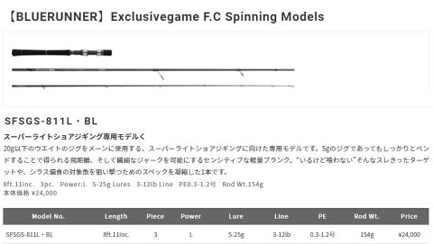 SFSGS-103H+・BLライトショアジギングの中核モデル 堤防はもとより、サーフ、磯とフィールドを選ばないレングスに、MAX70gまでフルキャスト可能なパワーを備えたブランク。